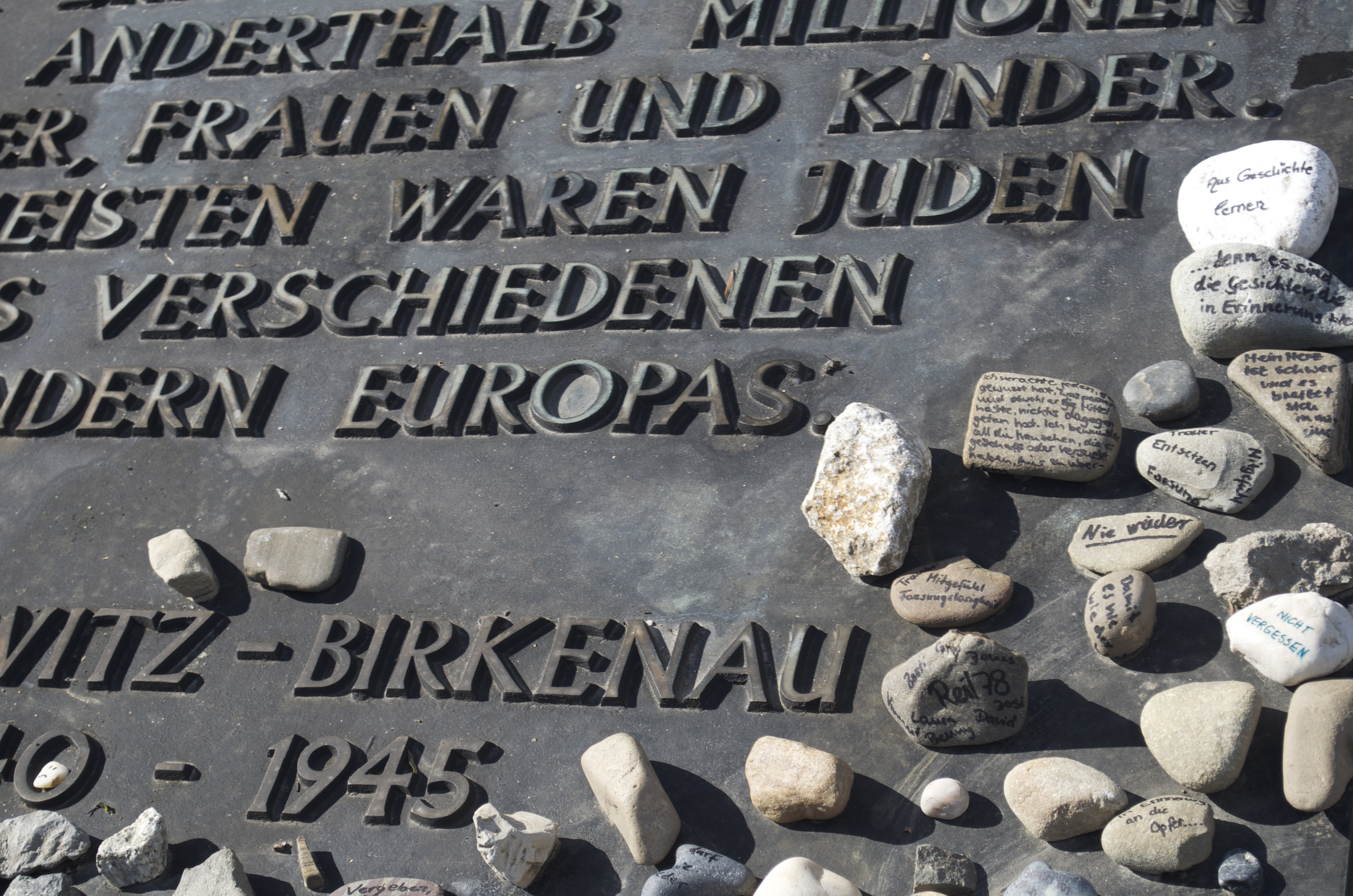 Stones stacked on a memorial plaque at Auschwitz with slogans written on them such as “Never again” and “Forgive but never forget.” Remember how I mentioned at the cemetery that Jews use rocks instead of flowers to show respect?