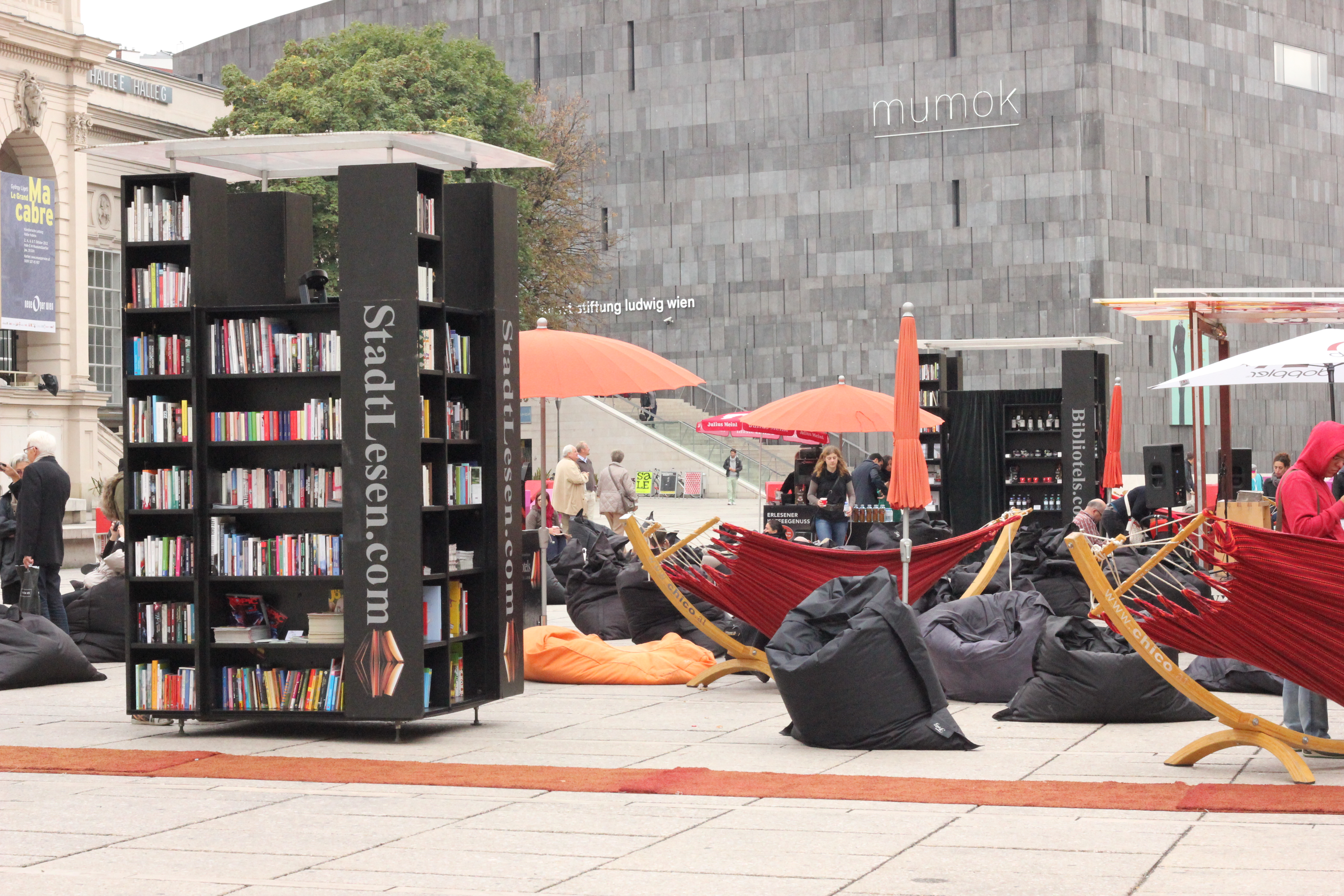 On our way to the museum we passed by a strange travelling outdoor library, a project to get more people to read called Stadt Lesen (City Reading). There were shelves with books you could just pick up and read, and hammocks and bean bag chairs all over in this one little section of the museum quarter. Pretty neat little project!
