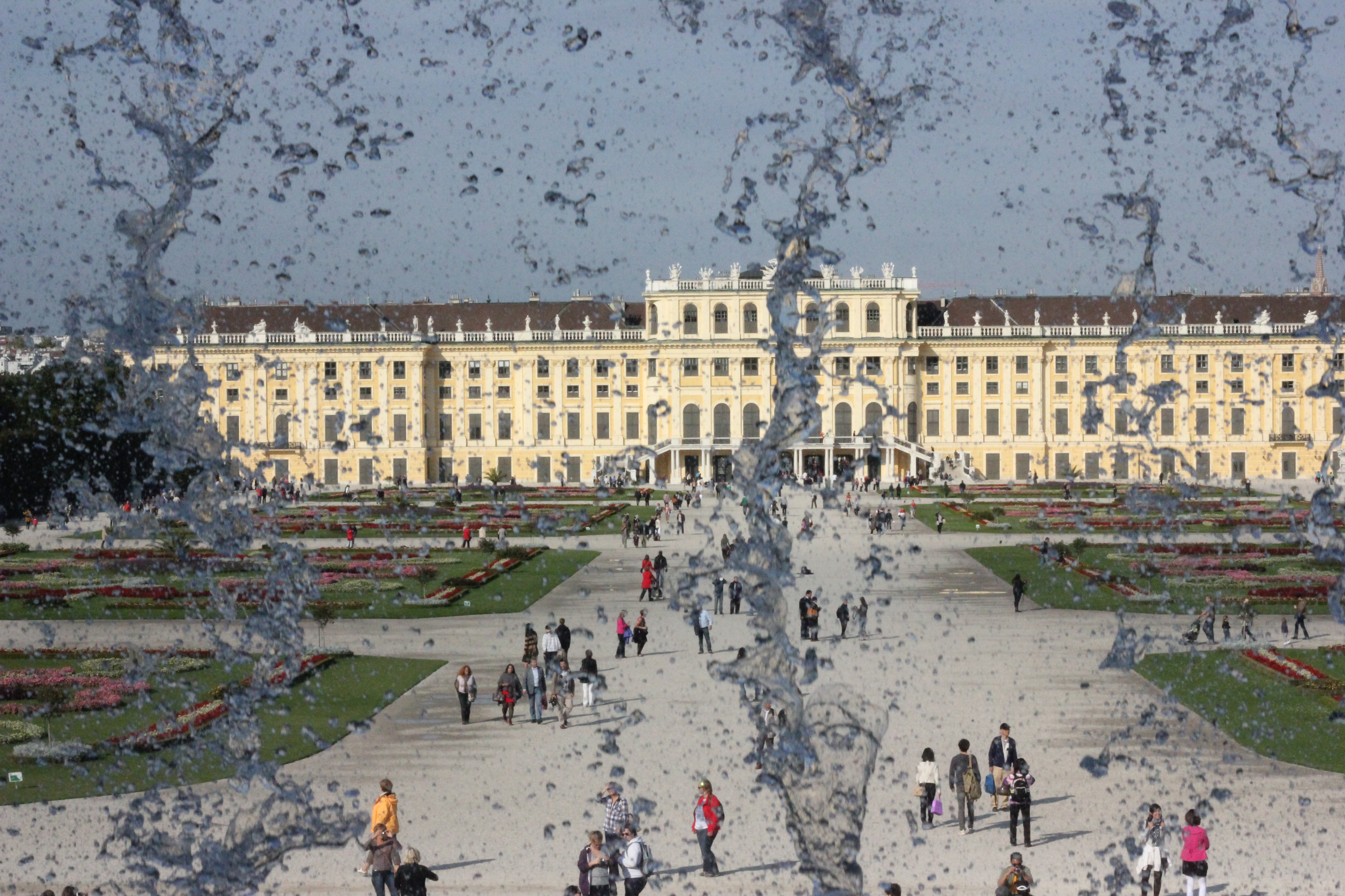 Looking through a fountain across the gardens at the back side of Schloss Schonebrunn.